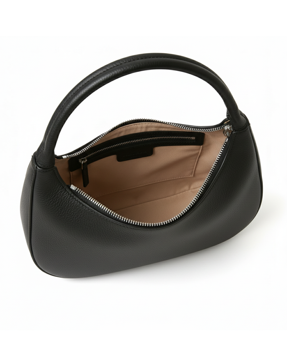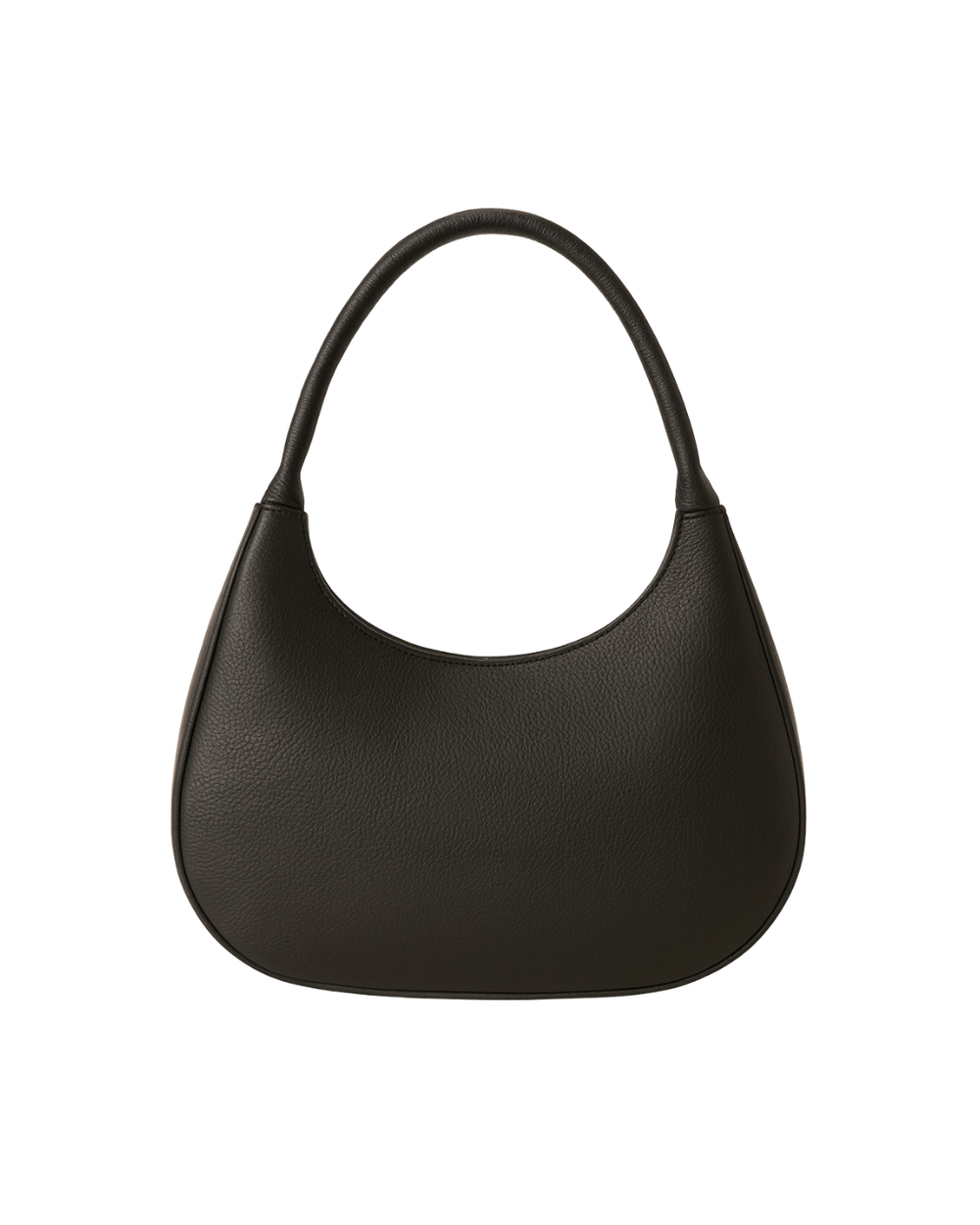A sleek crescent-shape hobo women's leather handbag that hugs the shoulder and sits flat against the body. Understated, modern, and logo-free.