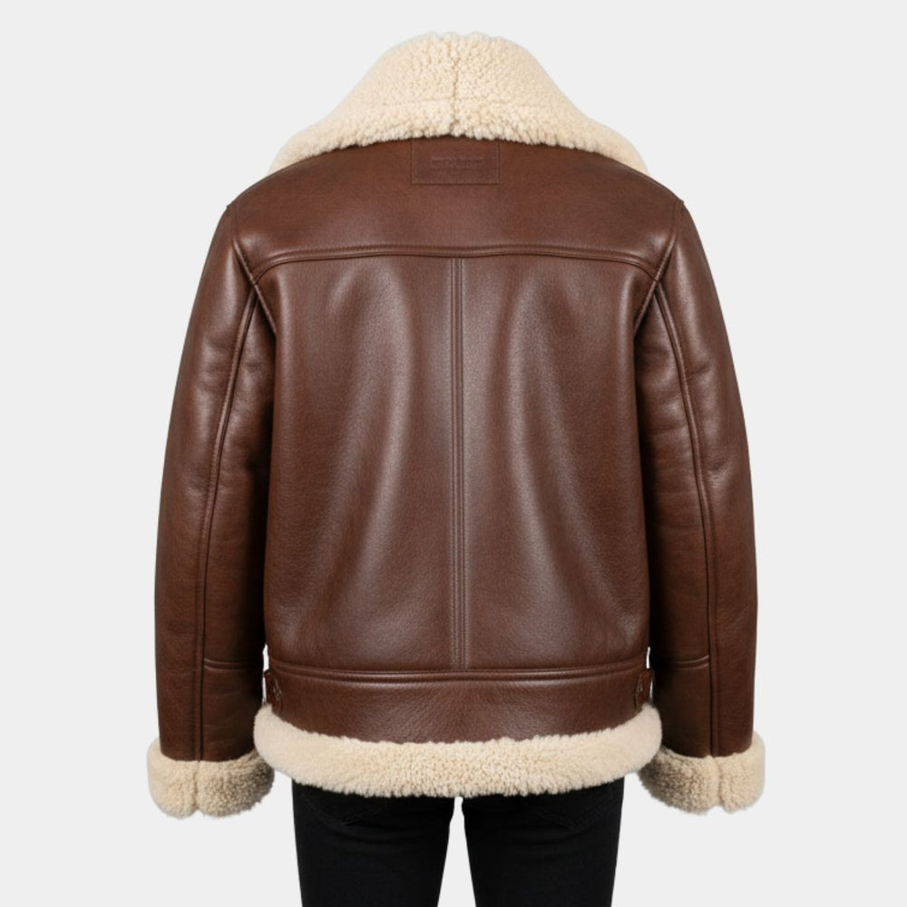 Inspired by classic aviator silhouettes, the jacket features a soft shearling collar, full shearling interior, and folded cuffs, offering both insulation and refined comfort. The rich brown leather exterior adds depth and character, while the structured cut ensures a flattering fit without compromising mobility.