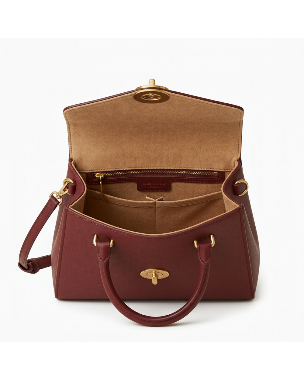A petite Trapezoid Ladies Leather Handbag with a classic twist-lock. Rich color, structured build, and logo-free elegance.