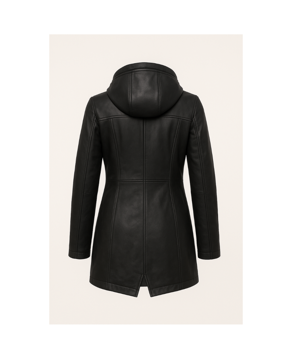 A modern black leather coat with a detachable hood designed for clean lines and everyday polish. The funnel collar, concealed two-way zip and four zip pockets keep it sleek, while the diamond-quilted lining adds light warmth. Sculpted princess seams shape the waist and a subtle back fishtail notch gives easy movement, making it your go-to all-weather hero for city days and nights.