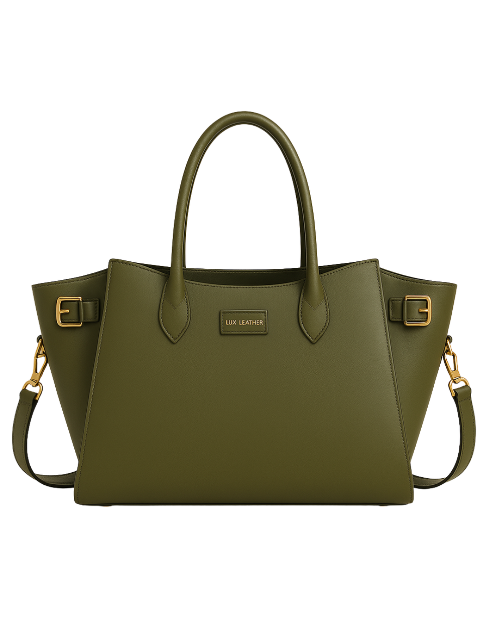 The Olive Winged Tote by Lux Leather pairs semi-matte olive leather with a structured trapezoid shape and elegant winged sides. Gold-tone hardware, top handles, and a detachable shoulder strap make it perfect for work and travel, while the spacious lined interior with zip and slip pockets keeps your essentials organized.