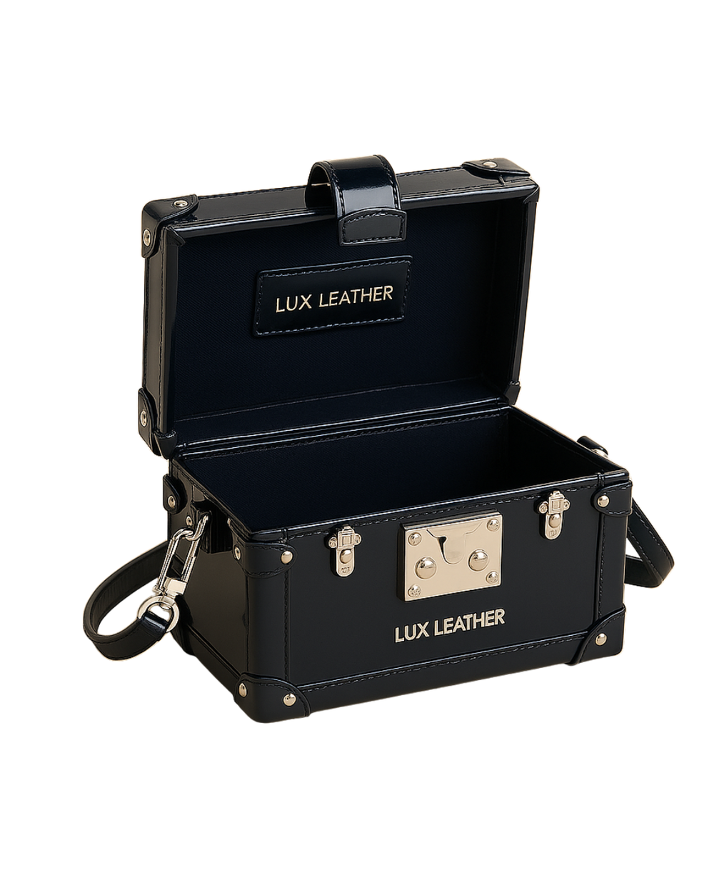 The Dark Shiny Blue Gloss Trunk Bag by Lux Leather blends vintage inspiration with modern allure. Crafted from deep navy patent leather and finished with silver hardware, it features a structured trunk silhouette, black suede lining, and detachable chain strap — the perfect statement piece for day or evening.
